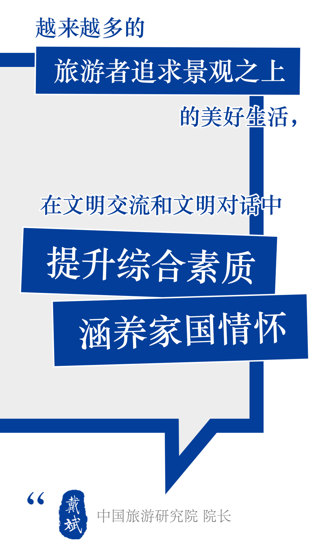 习近平总书记指出:“文化自信是一个国家、一个民族发展中最基本、最深沉、最持久的力量。向上向善的文化是一个国家、一个民族休戚与共、血脉相连的重要纽带。”理想、情怀、价值和意义从来都是驱动旅游事业可持续发展的内生动力,当且仅当旅游人发自内心地认同这一点,旅游业才会实现真正的跃升,旅游人才能自信而从容地站在舞台中央与世界对话。