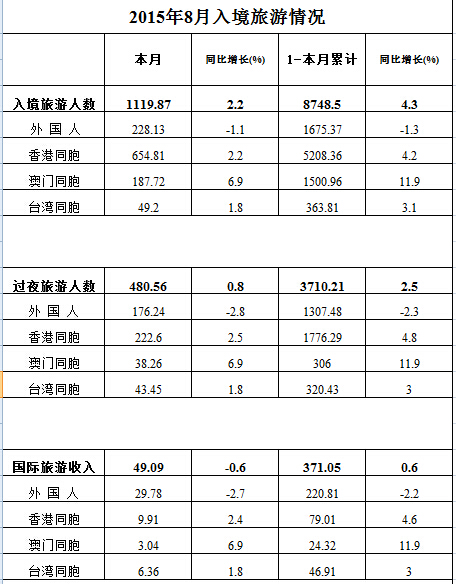 Inbound tourism in August 2015 Unit of measurement This month Year-on-year growth (%) 1-This month cumulative Year-on-year growth (%) Number of inbound tourists 10,000 person-times 星空彩票手机开户9.87 2.2 8748.5 4.3 Foreigners 10,000 person-times 228.13 -1.1 1675.37 -1.3 Hong Kong compatriots 10,000 person-times 654.81 2.2 5208.36 4.2 Macao compatriots 10,000 person-times 187.72 6.9 1500.96 11.9 Taiwan compatriots 10,000 person-times 49.2 1.8 363.81 3.1