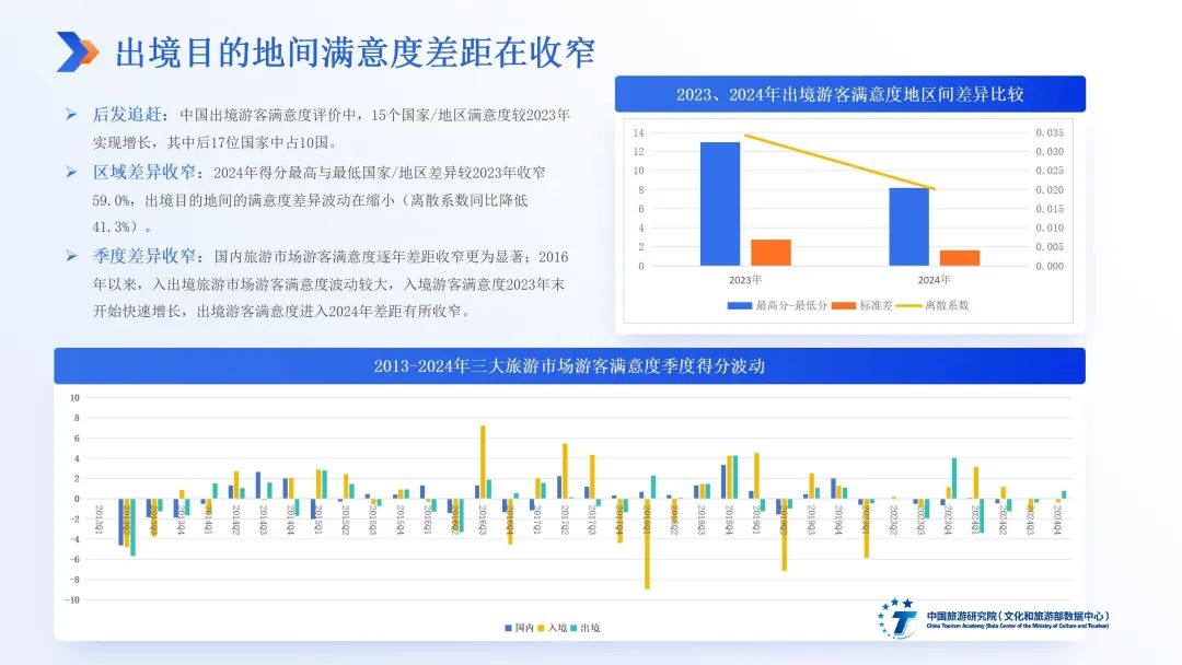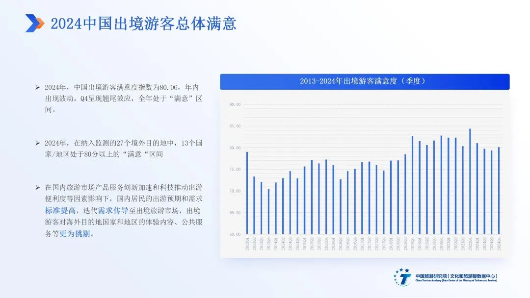 中国旅游研究院游客满意度课题组连续16年开展面向国内、入境、出境三大市场的游客满意度数据监测与研究。2024年,课题组综合线下机场拦访、线上平台调研、短信调查等多渠道数据,收集了面向27个主要出境目的地国家和地区的市场调查数据4万条,面向102个国家和地区的游客评价数据数十万条,形成《2024中国旅游者出境满意度研究报告》,核心观点如下: