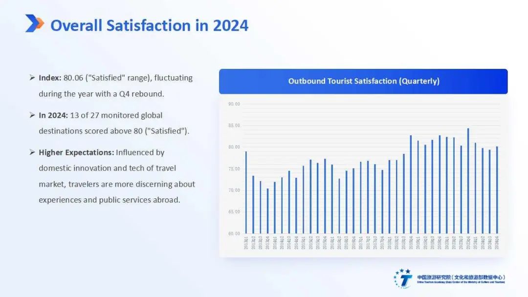2024年,中国公民出境旅游人数 1.23亿人次,出境旅游市场稳步复苏。国内旅游市场创新加速推动国内居民的出游预期和需求标准提高,迭代需求传导至出境旅游市场,出境游客对海外目的地国家和地区的体验内容、公共服务等更为挑剔。2024年,中国出境游客满意度指数为80.06,年内出现波动,全年处于“满意”区间。