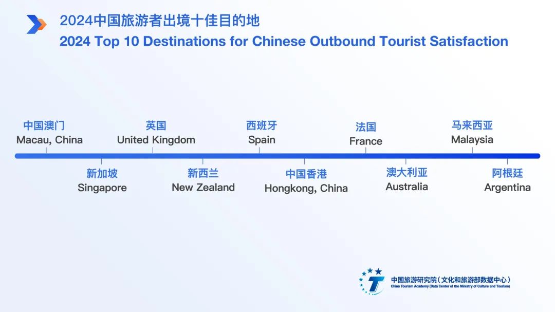 经综合测算,课题组发布了“2024中国旅游者出境满意度十佳目的地”:中国澳门、新加坡、英国、新西兰、西班牙、中国香港、法国、澳大利亚、马来西亚、阿根廷。