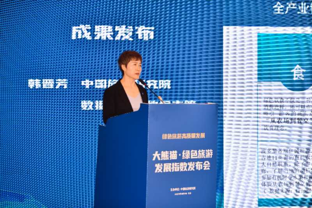 成果发布环节,中国旅游研究院数据分析所助理研究员韩晋芳发布《大熊猫·绿色旅游发展指数报告》,指出绿色旅游正在从被动应对负外部性走向主动担的责战略升维,从抽象的理念与战略走向鲜活的产业实践,从产业实践走向目的地建设。旅游研究课题组发布了绿色旅游实践优选目的地名单,分别是杭州、北京、成都、重庆、上海、湖州、长沙、贵阳、大连、广州。