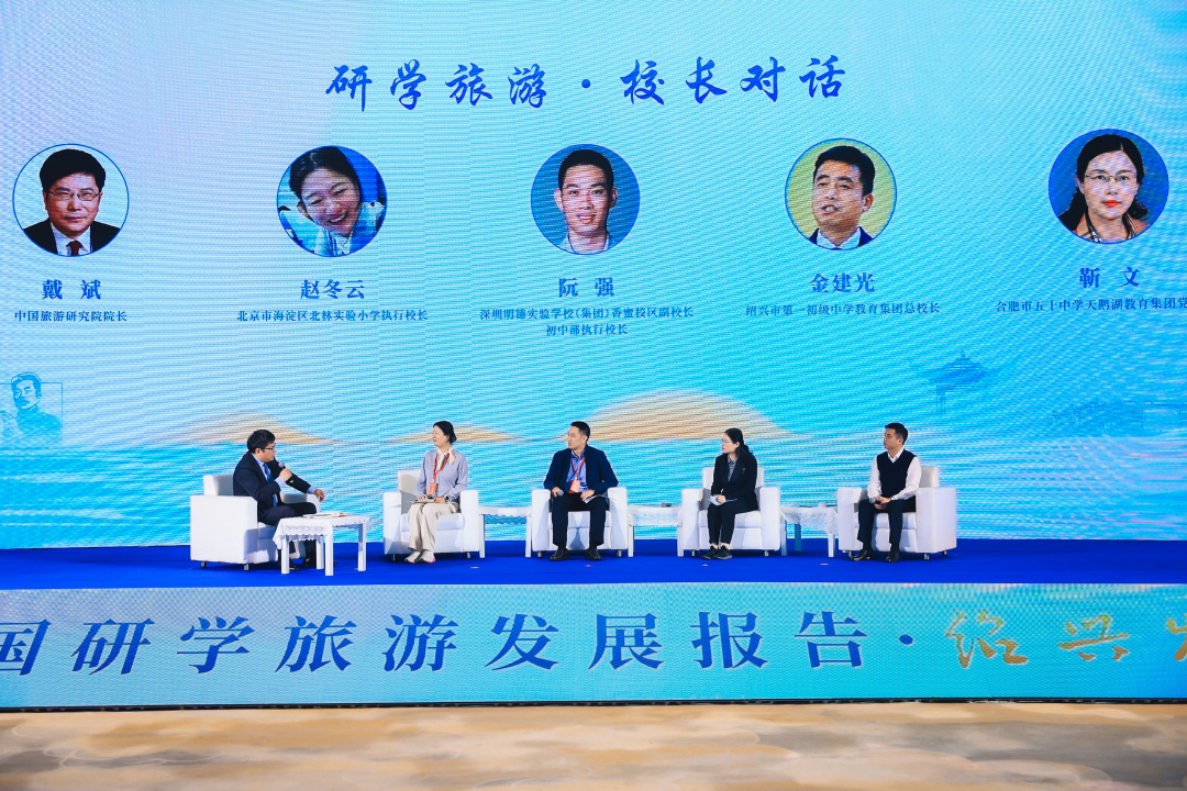 中国旅游研究院院长戴斌主持了圆桌对话一:“研学旅游·校长对话”,与北京市海淀区北林实验小学执行校长赵冬云、合肥市五十中学天鹅湖教育集团党委书记靳文、深圳明德实验学校(集团)香蜜校区副校长、初中部执行校长阮强、绍兴市第一初级中学教育集团总校长金建光共同围绕什么是好的教育、家校社如何有效协同、旅行和教育如何相互赋能等议题进行了探讨。