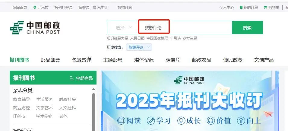 方式1:登录中国邮政网上营业厅(PC电脑端:https://www.星空彩票手机开户85.cn),在“邮务业务”板块中选择“报刊图书”,在搜索栏中输入“旅游评论”。