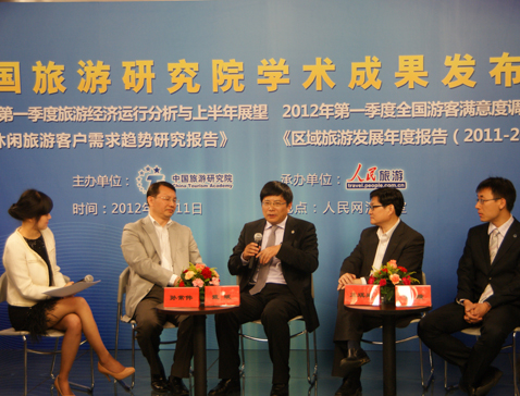 随后,戴斌院长、中国人民大学王琪延教授、携程旅行网北京旅游业务部总监孙常伟、国家旅游局监管司饭店管理处副处长杨宏浩博士、中国旅游研究院区域所副所长马晓龙博士、吴普博士、黄璜博士、张佑印博士以及产业所杨彦锋博士、陈旭博士等分别参加了第一季度旅游经济运行和全国游客满意度研讨、《中国休闲旅游客户需求趋势研究报告》研讨以及《区域旅游发展年报报告(2011-2012)》等三个圆桌研讨,并回答了主持人和现场媒体的提问。