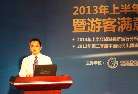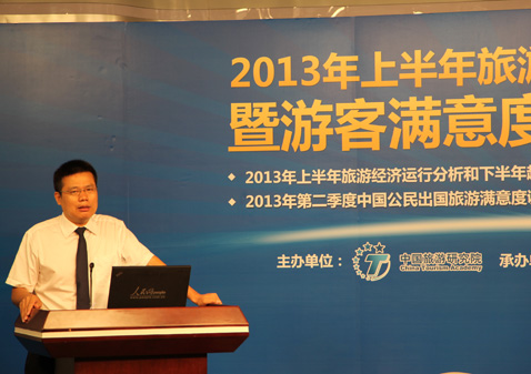 2013年7月11日由中国旅游研究院主办,人民网旅游频道、旅游卫视协办的2013年上半年旅游经济运行分析暨游客满意度调查报告发布会在人民网演播室举行。中国社会科学院旅游研究中心主任张广瑞研究员、北京市旅游发展委员会旅游环境与公共服务处处长王清、海航旅业战略与发展创新部总经理孙金伟先生、易生旅游旅游发展事业部总经理郑黎东、中国旅游研究院产业所所长李仲广副研究员等出席了发布会。来自人民日报、新华社、中央电视台、中央人民广播电台、中国国际广播电台、中国旅游报、经济日报、大公报、央视网、中国网、新浪网、搜狐网等媒体机构代表也参加了发布会。
