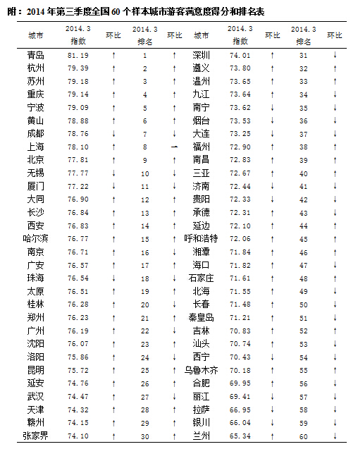 国内旅游市场秩序治理初见成效2014年10月10日,中国旅游研究院在京发布2014年第三季度全国游客满意度调查报告。调查显示, 2014年第三季度全国游客满意度指数为74.52,虽然仍处于"一般"水平,但是同比上升0.23,环比上升1.68。国内游客满意度总体趋好,"食住行游购娱"等旅游服务的质量以及旅行社、景区等两大行业的满意度均处于调查以来最高值,达到"基本满意"水平。团队游客满意度大幅度上升2014年第三季度国内游客满意度为72.90,同比上升1.60,环比上升0.80。其中,团队游客满意度上升幅度最大,满意度指数为73.24,同比上升2.35,环比上升3.54;国内散客满意度也上升,满意度指数为72.73,同比上升1.20,环比上升2.16。值得指出的是,团队游客满意度自2013年第二季度以来首次高于国内散客满意度,显示《中华人民共和国旅游法》颁布实施之后并经过行业治理,旅行社服务质量有了显著的提高。其中团队游客对"食住行游购娱"等旅游总体服务的满意度为76.27,是自2010年全国游客满意度发布以来最高,处于"基本满意"水平,同比上升3.51,环比上升3.57。团队游客对旅行社的满意度也创下新高,指数为76.29,处于"基本满意"水平,同比上升1.08,环比上升6.08。"一法两服务"推动旅游服务和旅游业发展环境持续优化《中华人民共和国旅游法》正式实施一年来旅行社、景区等旅游行业针对广大游客反映强烈的热点、难点问题进行了有针对性的整改,城市面向游客的公共服务体系不断完善、商业服务水平持续提升。2014年第三季度旅游服务、城市公共服务、城市环境等满意度均上升。"食住行游购娱"等旅游服务满意度指数为75.98,处于"基本满意"水平,也同比上升3.48,环比上升3.35。旅游服务处于2010年全国游客满意度发布以来的最高水平,达到我国《质量发展纲要(2011-2020年)》提出2015年生活性服务业顾客满意度达到75以上的服务业质量发展目标。景区服务是当前社会和游客关注的焦点当前旅游大众化向纵深方向发展,景区服务成为大众生活常态和城市发展常态的现象也日益明显,已经成为社会和游客关注的焦点。本季度全国游客满意度调查收集到游客关于景区的网络评论达到14.5万条,占总数的12.2%。主要集中在景区容量管理、旅游项目创新、门票优惠、游客文明行为、信息化等方面。景区在社会关注程度加大和旅游市场治理力度加强的背景下加快完善服务,景区市场化改革的加快和企业经营战略举措的持续推出,都促使景区服务质量不断提升,例如故宫通过提前开门分流游客、百度推出景区直达服务、携程网和同程网加快景区预订信息化合作等。2014年第三季度景区服务的满意度达到调查发布以来的新高,指数为75.68,处于"基本满意"水平,同比上升0.79,环比上升5.38。游客对出入境市场的旅行社和购物、网络旅游的满意度相对较低,特别是对旅游投诉的满意度连续下降2014年以来,游客的投诉满意度指数呈持续下降态势,第一至三季度分别为69.08、68.52和66.88。入境、出境游客对旅行社服务、购物的满意度也较低且出现下降,例如本季度入境的满意度为74.07,较上一季度下降0.13。从调查数据看,入境游客在交通、购物、旅行社方面的满意度较低,分别为70.73、70.61、70.11。此外,第三季度出境游客对旅行社服务的满意度仅为70.33,也远低于其他指标。