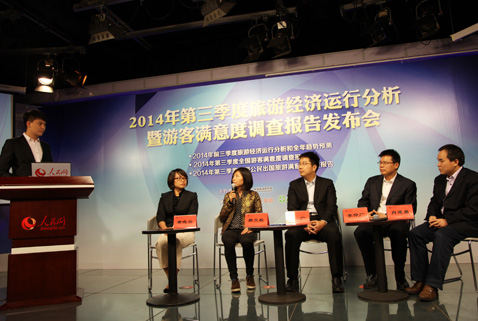 10月10日下午,由中国旅游研究院主办,人民网旅游频道、旅游卫视协办的2014年第三季度旅游经济运行分析暨游客满意度调查报告发布会在人民网演播室举行。中国旅游研究院院长戴斌教授出席发布会并做主旨演讲。中青旅质检合规部总经理李广、京东开放平台事业部生活旅行业务总监鲜文敏、中国旅游研究院产业所所长李仲广副研究员、国家旅游经济实验室负责人唐晓云副研究员等参加了发布会。来自人民日报、新华社、中央电视台、中国国际广播电台、中国日报、经济日报、中国旅游报、中国网、央视网、中国旅游网、搜狐网、凤凰网、中国经济网、蓝海电视、旅行社杂志等媒体机构的代表也参加了发布会。