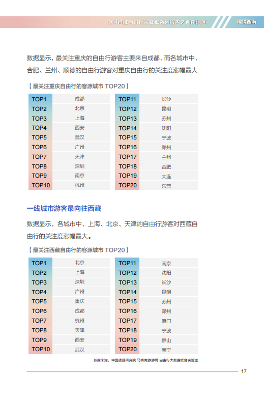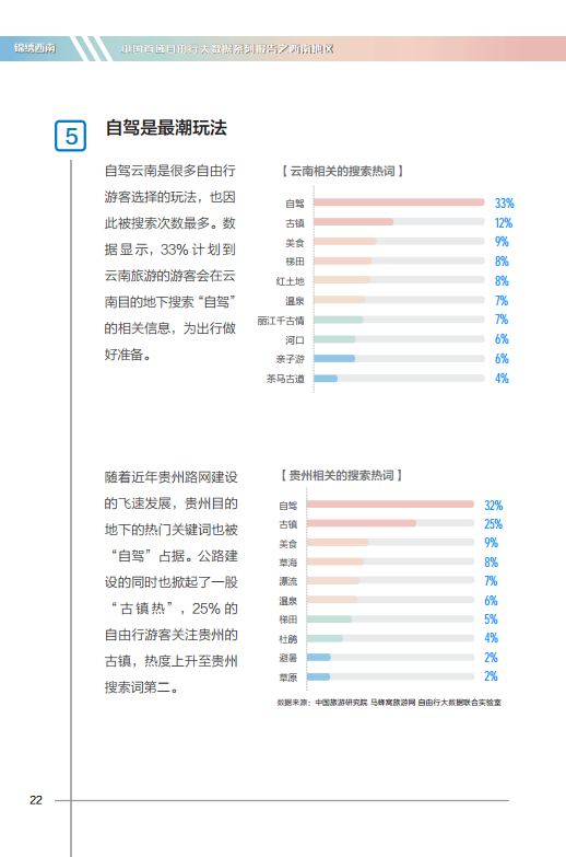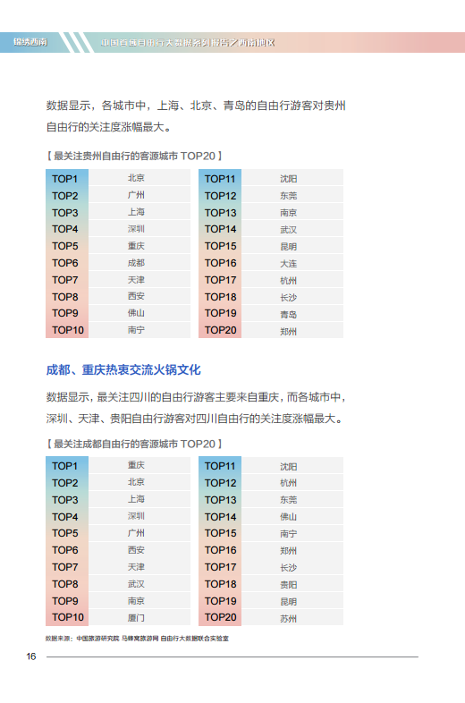 该报告以双方旅游大数据为基础,深度剖析了中国西南地区五省区市——云南、贵州、四川、重庆、西藏的旅游市场现状与未来发展趋势。报告显示,西南五省区市的旅游热度近年有大幅增长,自驾、古镇、美食成为西南地区最受旅行者关注的关键词。报告全文如下: