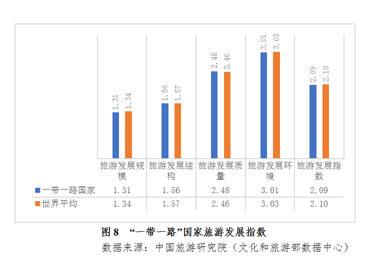 通过对四个维度,即旅游发展规模、旅游发展结构、旅游发展质量、旅游发展环境,并拟合形成旅游发展综合指数,面向162个国家和地区进行综合数据采集和建模(建模方法见附件1)分析,测算各国/地区的旅游发展指数。“一带一路”国家的旅游综合竞争指数的量化评价显示,总体来看,“一带一路”国家的旅游发展指数与世界平均水平基本持平,但除旅游发展质量外,“一带一路”国家在其他三个维度的平均发展水平均略低于世界平均水平。表明“一带一路”国家的旅游业在其国民经济中的地位较为突出。“一带一路”国家的旅游发展潜力空间较大,有待进一步挖掘客源市场,应重视地区间,尤其是“一带一路”区域内的旅游交往。